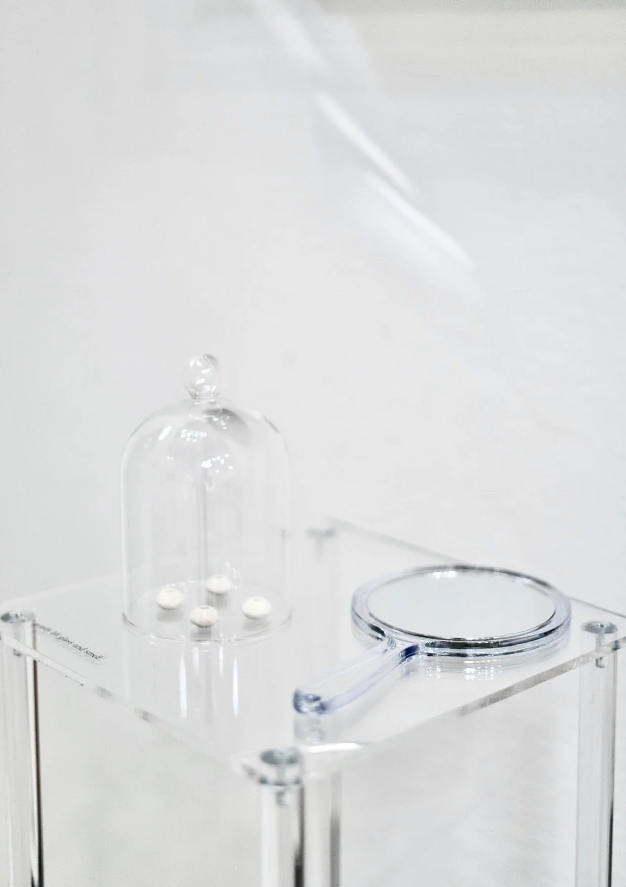 ABCC11 and the Absence of You , 2024 mixed media sculpture: resin, digital collage, paper, human hair, rocks, mirror, scented elements